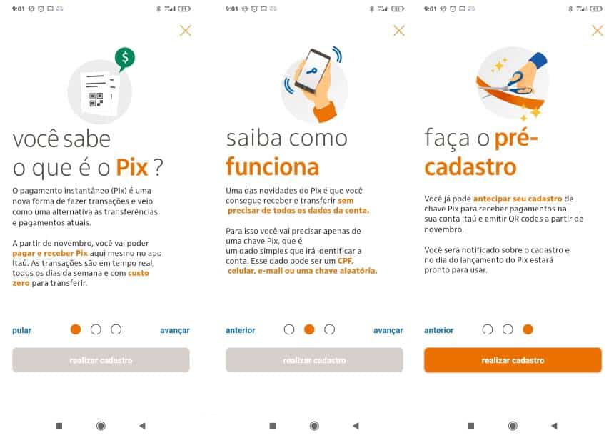 4. Prossiga com a explicação de como o Pix funciona ao tocar em “Avançar”. Então, clique em “Realizar cadastro”;
