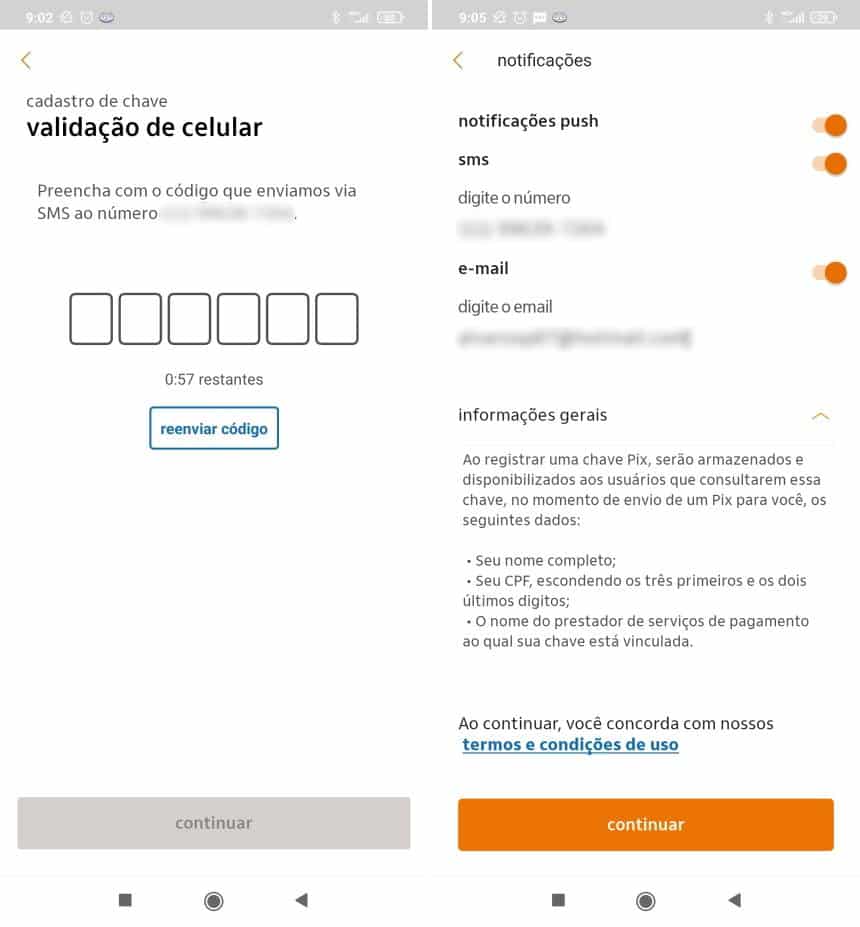 6. Digite o código recebido e, na próxima tela, preencha os dados solicitados. Então, toque em “Continuar”;